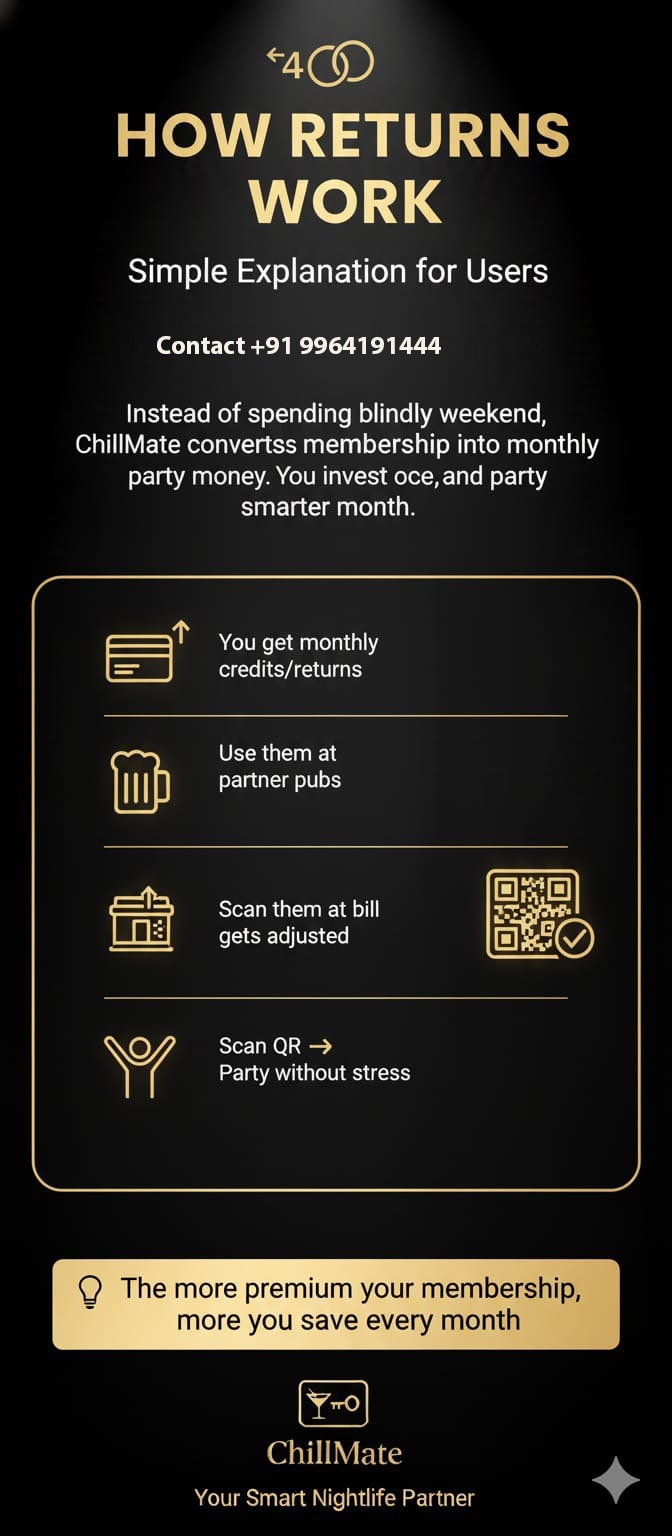Instead of spending blindly every weekend, ChillMate converts your membership into smart monthly party value. You invest once and enjoy planned nightlife savings every month.